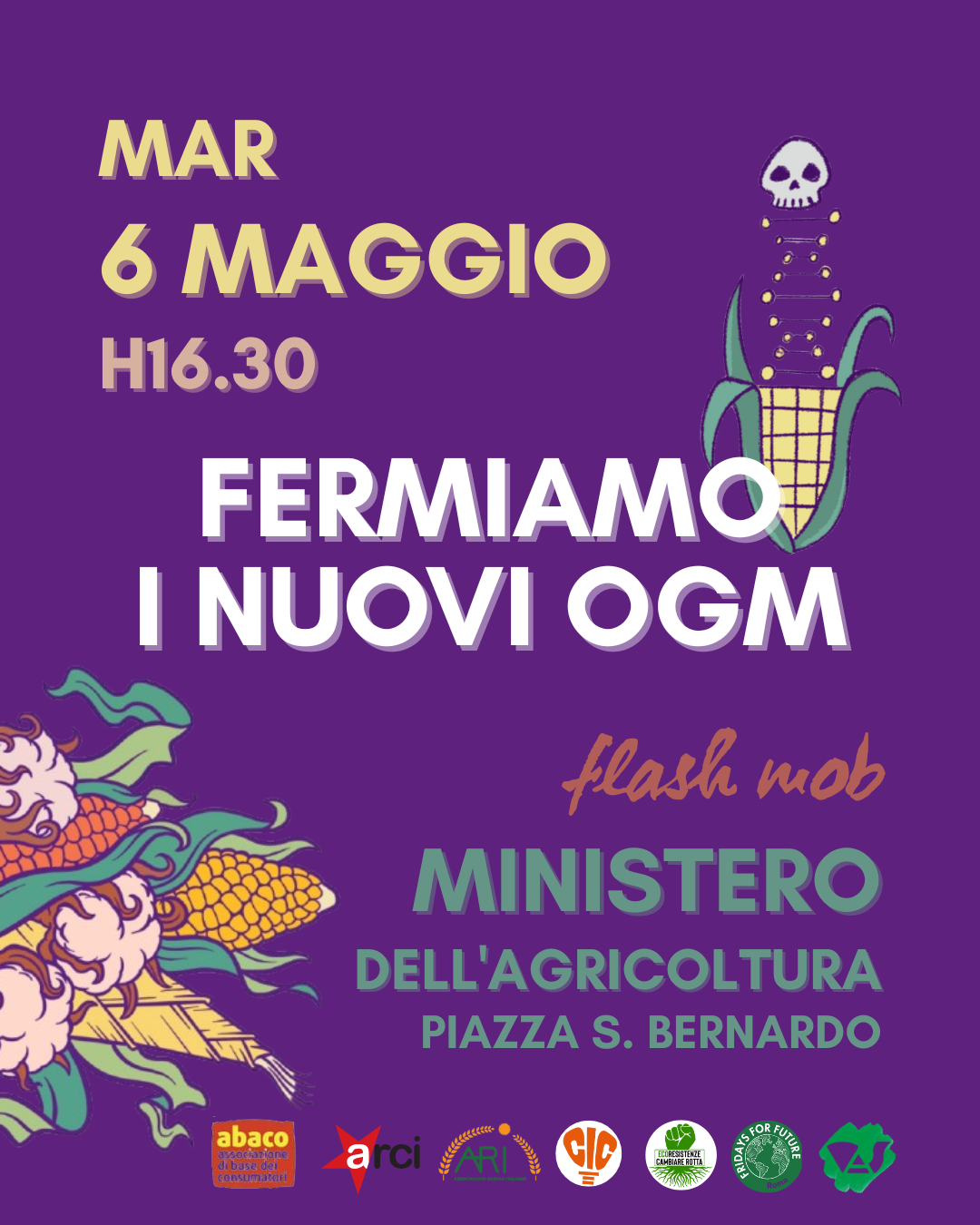 Come Centro Internazionale Crocevia, ARCI, Associazione Rurale Italiana, Ecoresistenze, Fridays For Future, A.Ba.Co e Verdi Ambiente e Società lanciamo un presidio il 6 maggio alle 16:30 in Largo San Bernardo, nei pressi del Ministero dell’Agricoltura. Contesteremo la scelta di Lollobrigida di consegnare a multinazionali agrochimiche come Bayer, Corteva, Syngenta e BASF il nostro sistema alimentare, con la scusa che la liberalizzazione dei nuovi OGM aiuterà l’Italia a contrastare gli effetti del cambiamento climatico.